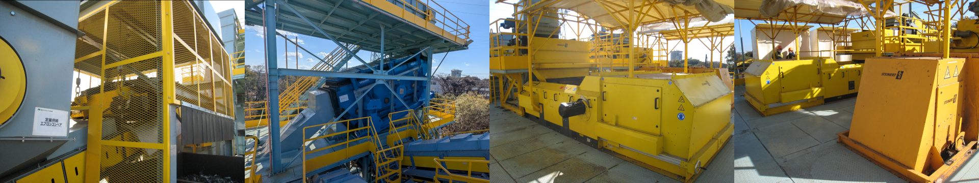 左から STEINERT UME95(吊下げ磁選機) → SPALECK 3Dコンビスクリーン(2段式ふるい分け機)→ STEINERT NES150(渦電流選別機)→ STEINERT ISS200(電磁誘導センサー選別機)