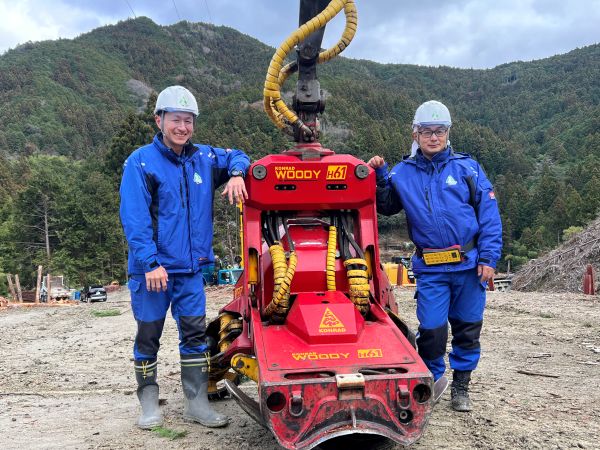 今回は伐採、搬出を行っている山林で、代表取締役 川井博貴様(写真 右)と、現場で操作をされている林産事業課長の田上政一様 (写真 左) にお話を伺いました。